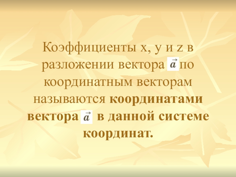 Слайд 11Коэффициенты х, у и z в разложении вектора по координатным