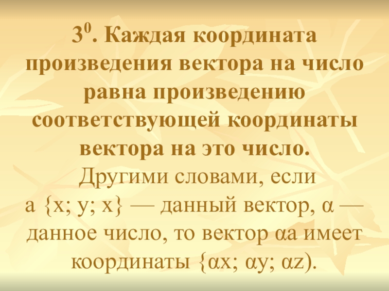 а {х; у; х} — данный вектор, α — данное число, то вектор αa имеет координаты {αх; αу; αz).