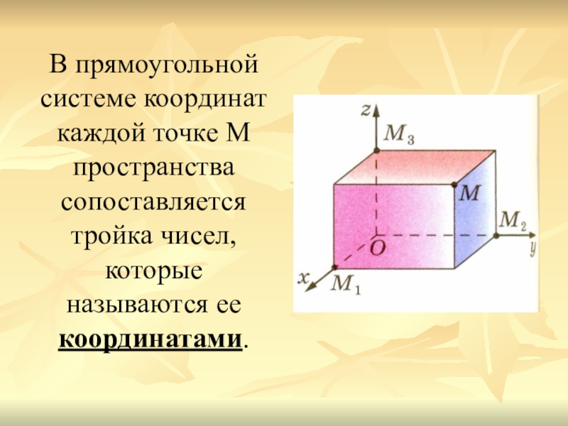 Слайд 7В прямоугольной системе координат каждой точке М пространства сопоставляется тройка чисел,