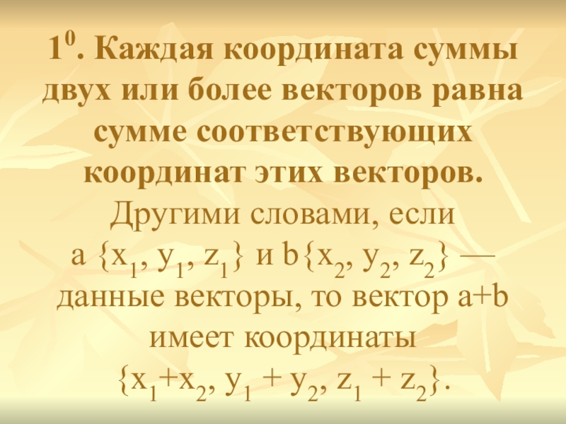 Слайд 1310. Каждая координата суммы двух или более векторов равна сумме соответствующих