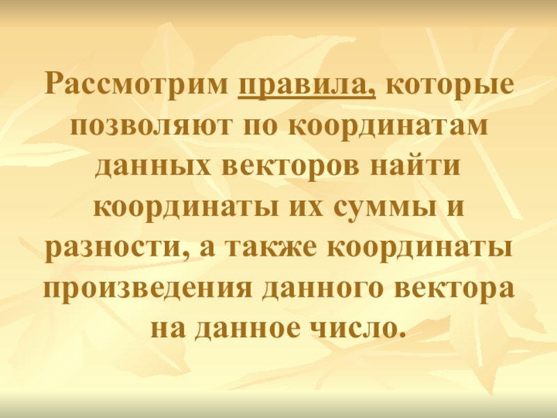 Слайд 12Рассмотрим правила, которые позволяют по координатам данных векторов найти координаты их