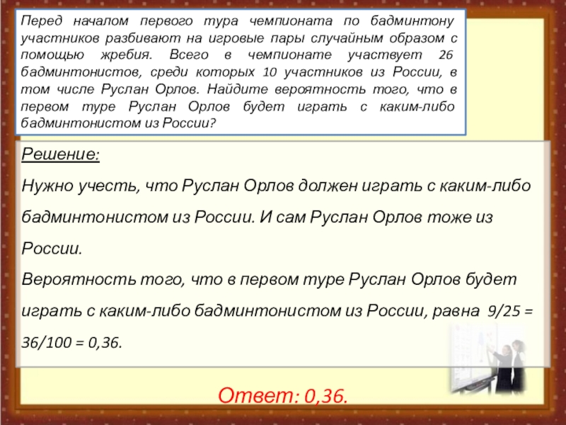 Вероятность того, что в первом туре Руслан Орлов будет играть с каким-либо бадминтонистом из России, равна 9/25 = 36/100 = 0,36.