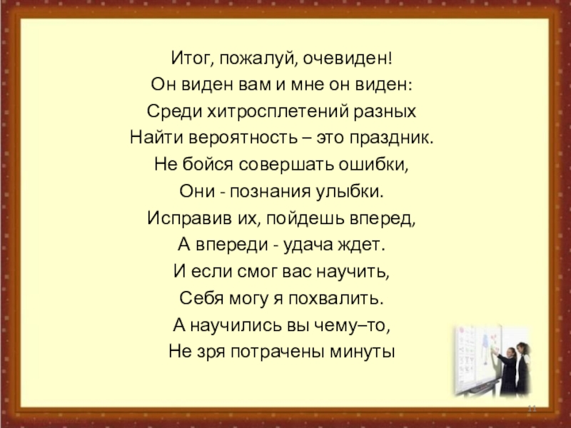Это сайт презентаций, где можно хранить и обмениваться своими презентациями, докладами, проектами, шаблонами в формате PowerPoint с другими пользователями. Мы помогаем школьникам, студентам, учителям, преподавателям хранить и обмениваться учебными материалами.