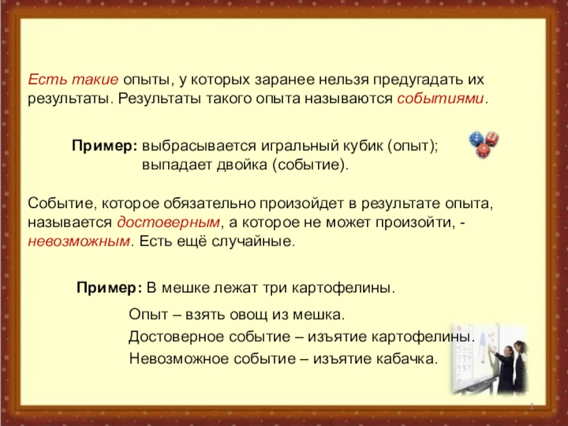 Событие, которое обязательно произойдет в результате опыта, называется достоверным, а которое не может произойти, - невозможным. Есть ещё случайные.