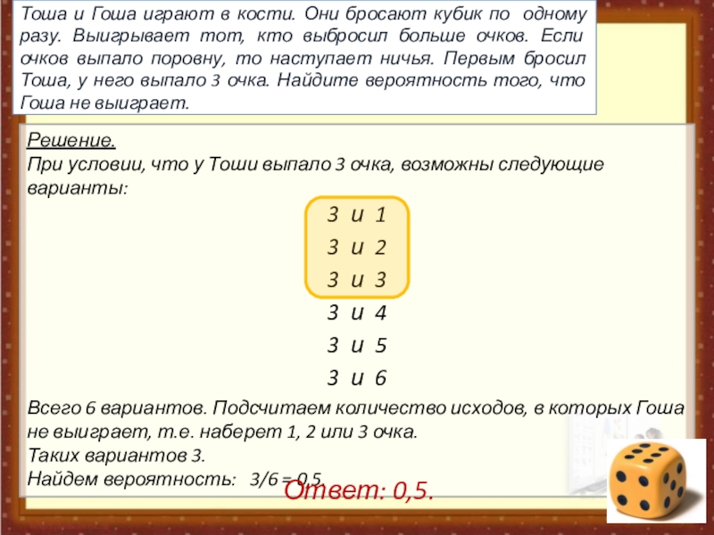 Тоша и Гоша играют в кости. Они бросают кубик по одному разу. Выигрывает тот, кто выбросил больше очков. Если очков выпало поровну, то наступает ничья. Первым бросил Тоша, у него выпало 3 очка. Найдите вероятность того, что Гоша не выиграет.