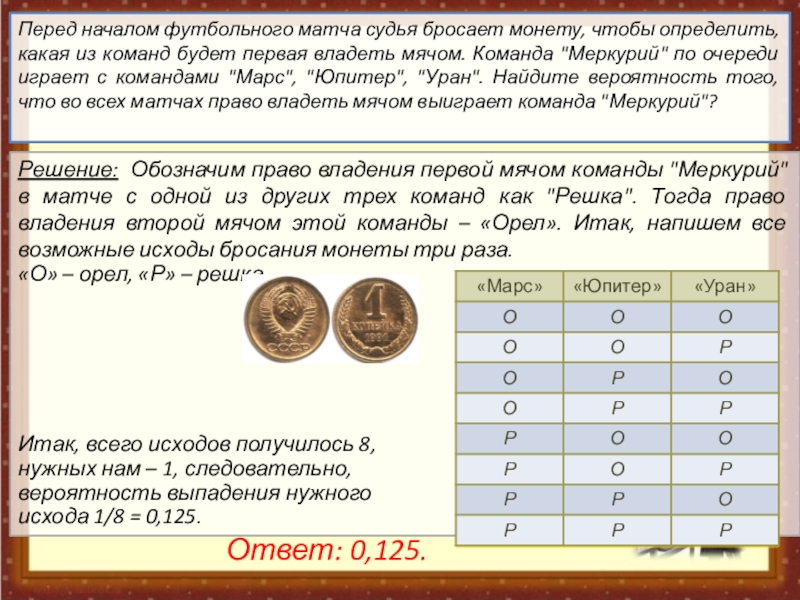 Перед началом футбольного матча судья бросает монету, чтобы определить, какая из команд будет первая владеть мячом. Команда "Меркурий" по очереди играет с командами "Марс", "Юпитер", "Уран". Найдите вероятность того, что во всех матчах право владеть мячом выиграет команда "Меркурий"?