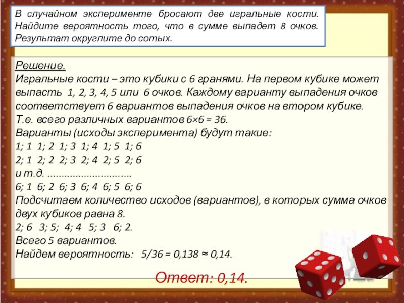 В случайном эксперименте бросают две игральные кости. Найдите вероятность того, что в сумме выпадет 8 очков. Результат округлите до сотых.