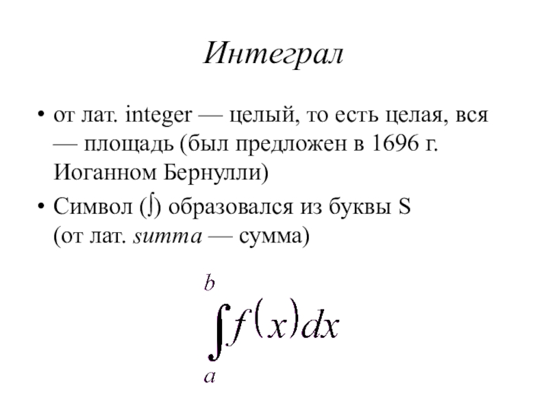 Интегралот лат. integer — целый, то есть целая, вся — площадь (был предложен в 1696 г. Иоганном