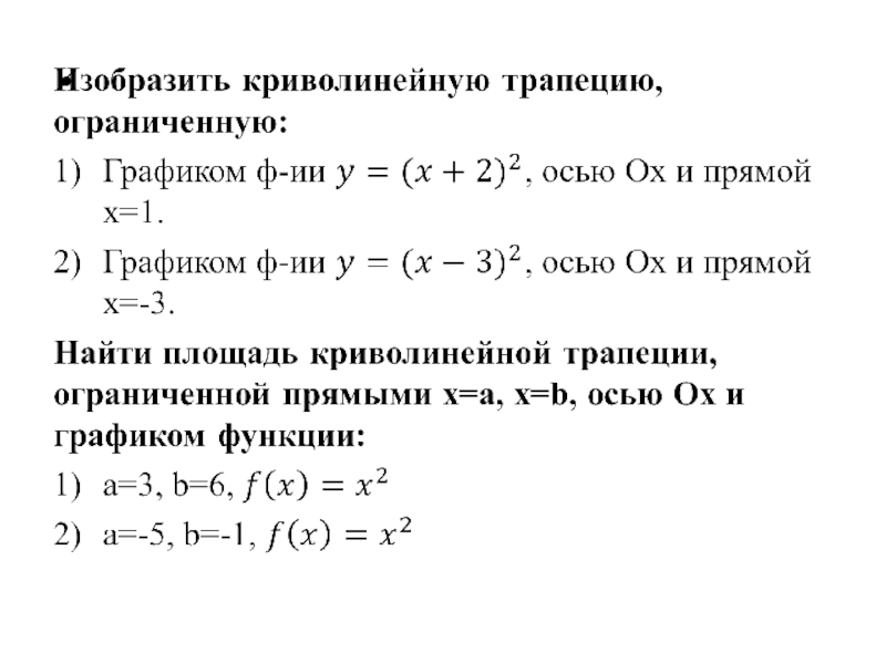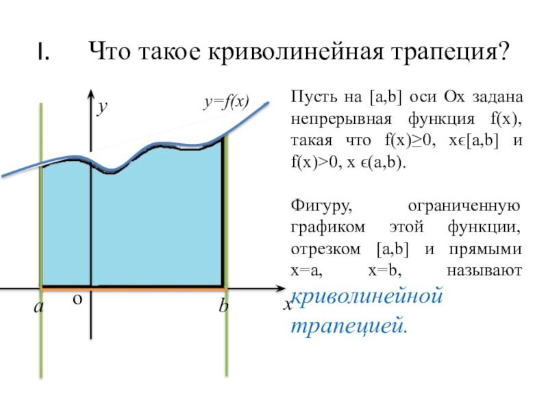 Фигуру, ограниченную графиком этой функции, отрезком [a,b] и прямыми x=a, x=b, называют криволинейной трапецией.