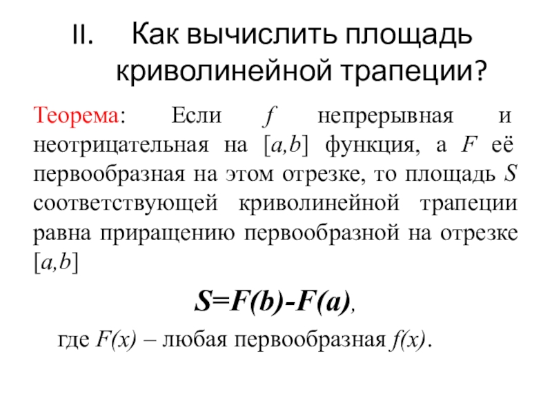 [a,b] функция, а F её первообразная на этом отрезке, то площадь S соответствующей криволинейной трапеции равна приращению первообразной на отрезке [a,b]