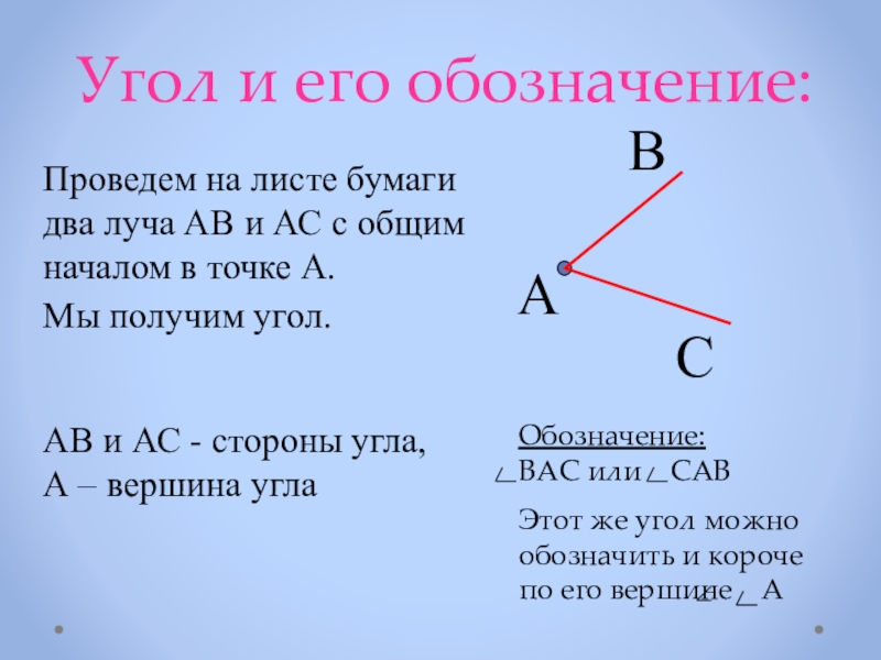 Проведем на листе бумаги два луча АВ и АС с общим началом в точке А.