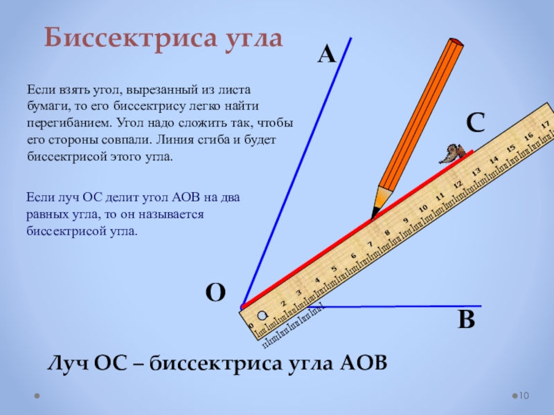 Если луч ОС делит угол АОВ на два равных угла, то он называется биссектрисой угла.