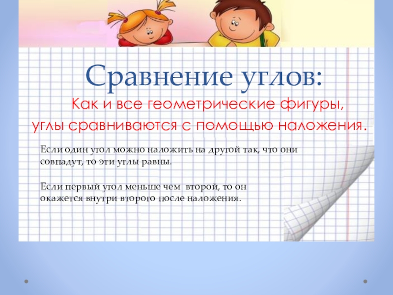 Если один угол можно наложить на другой так, что они совпадут, то эти углы равны.