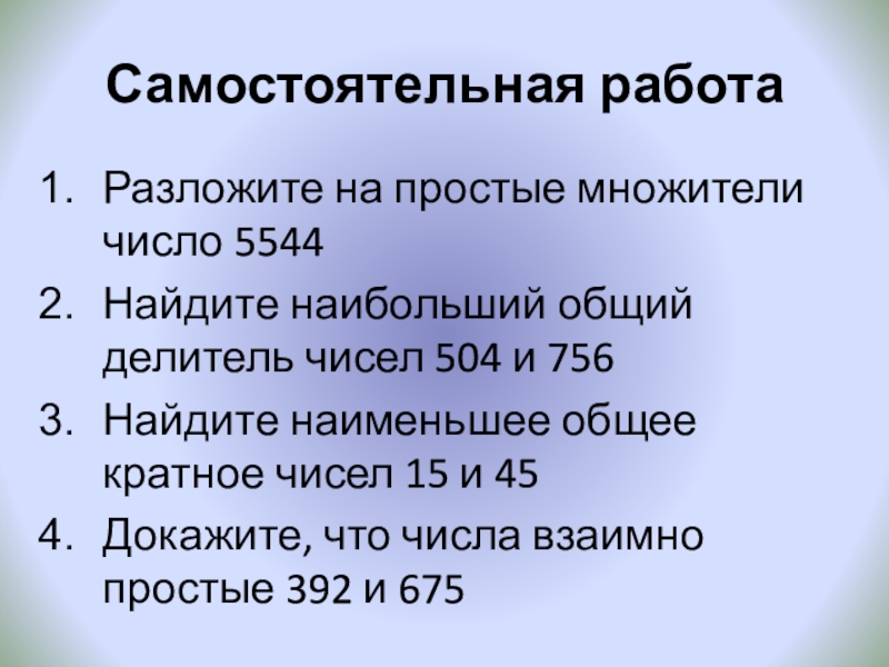 Самостоятельная работаРазложите на простые множители число 5544Найдите наибольший общий делитель чисел 504 и 756Найдите наименьшее общее кратное