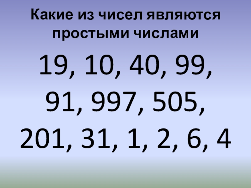 Какие из чисел являются простыми числами19, 10, 40, 99, 91, 997, 505, 201, 31, 1, 2, 6,