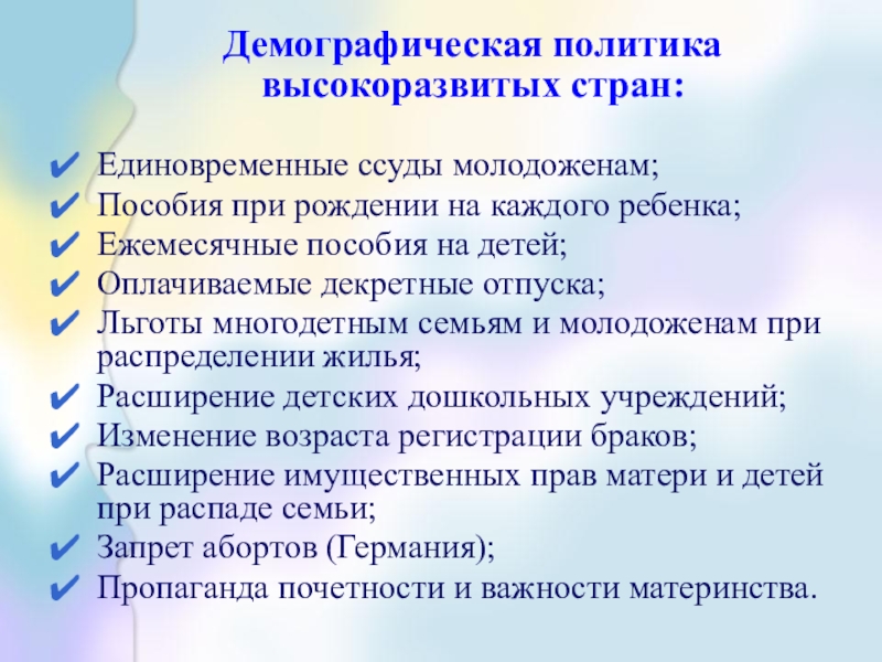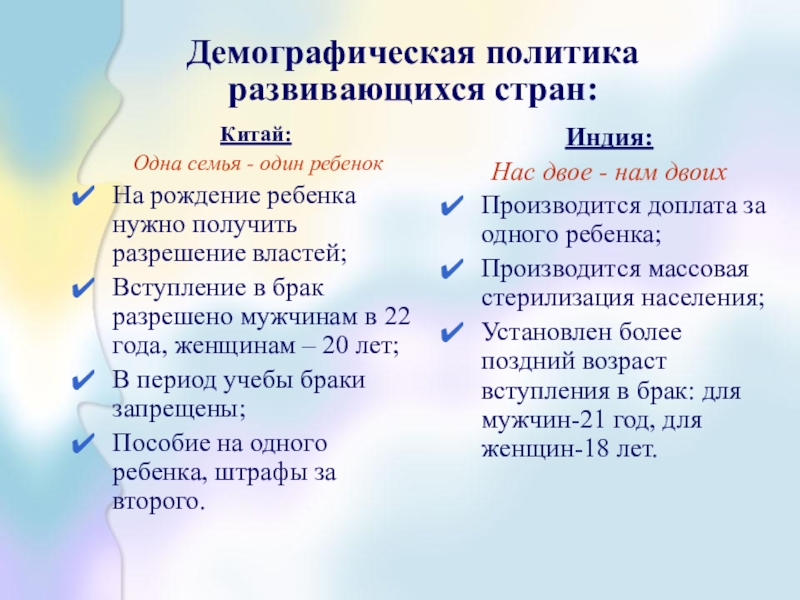 Установлен более поздний возраст вступления в брак: для мужчин-21 год, для женщин-18 лет.
