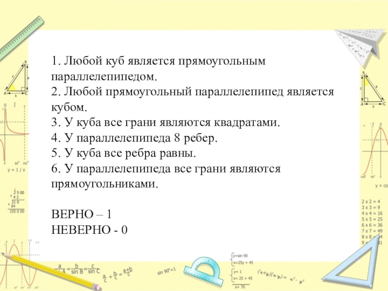 5. Если длину прямоугольного параллелепипеда увеличить в два раза, то его объём … в … раз (а).