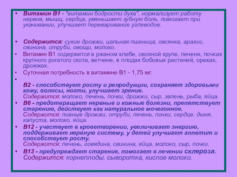 Слайд 21Витамин В1 - "витамин бодрости духа", нормализует работу нервов, мышц, сердца,