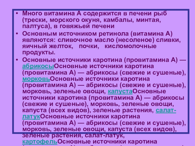 Основные источники каротина (провитамина А) — абрикосыОсновные источники каротина (провитамина А) — абрикосы (свежие и сушеные), морковьОсновные источники каротина (провитамина А) — абрикосы (свежие и сушеные), морковь, зеленые овощи, капустаОсновные источники каротина (провитамина А) — абрикосы (свежие и сушеные), морковь, зеленые овощи, капуста (всех видов), зеленые растения, салат-латукОсновные источники каротина (провитамина А) — абрикосы (свежие и сушеные), морковь, зеленые овощи, капуста (всех видов), зеленые растения, салат-латук, картофельОсновные источники каротина (провитамина А) — абрикосы (свежие и сушеные), морковь, зеленые овощи, капуста (всех видов), зеленые растения, салат-латук, картофель, слива, все желтые фрукты и овощи.