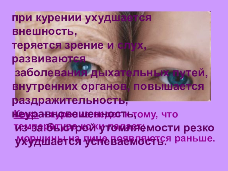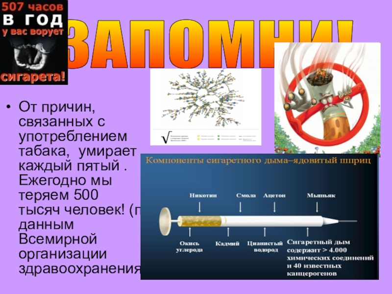 Слайд 28От причин, связанных с употреблением табака, умирает каждый пятый .Ежегодно мы