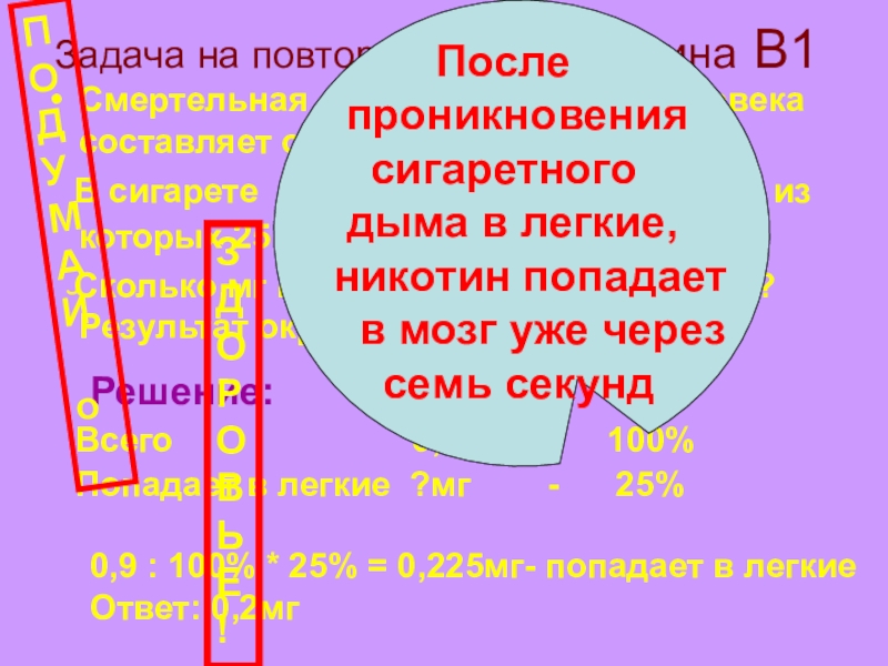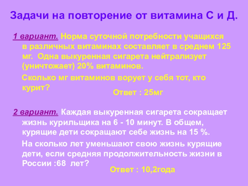 потребности учащихся в различных витаминах составляет в среднем 125 мг. Одна выкуренная сигарета нейтрализует (уничтожает) 20% витаминов.