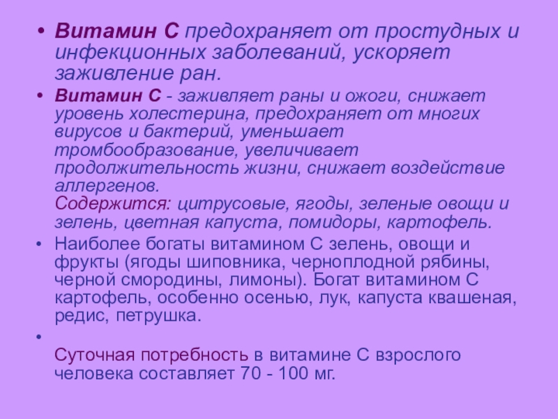 Слайд 24Витамин С предохраняет от простудных и инфекционных заболеваний, ускоряет заживление ран.