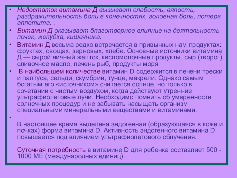 Слайд 26Недостаток витамина Д вызывает слабость, вялость, раздражительность боли в конечностях, головная