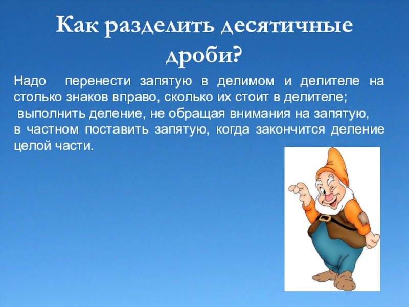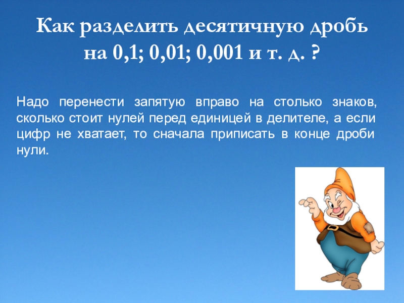 Надо перенести запятую вправо на столько знаков, сколько стоит нулей перед единицей в делителе, а если цифр не хватает, то сначала приписать в конце дроби нули.