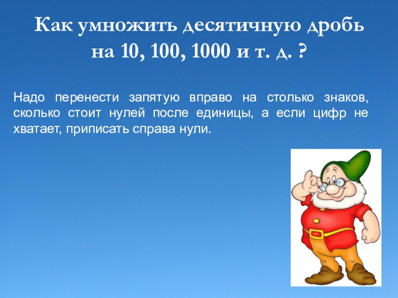 Надо перенести запятую вправо на столько знаков, сколько стоит нулей после единицы, а если цифр не хватает, приписать справа нули.