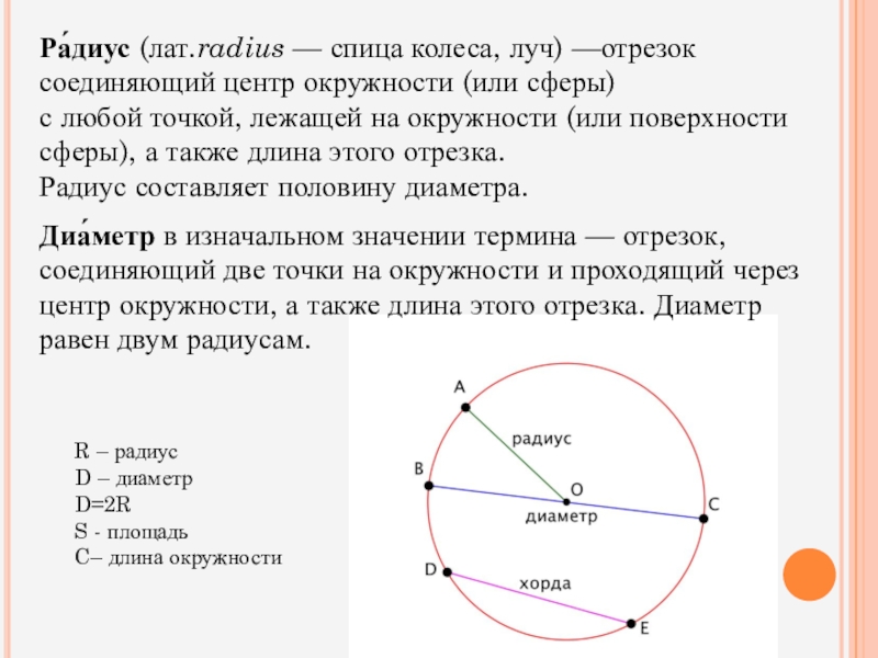 Диа́метр в изначальном значении термина — отрезок, соединяющий две точки на окружности и проходящий через центр окружности, а также длина этого отрезка. Диаметр равен двум радиусам.