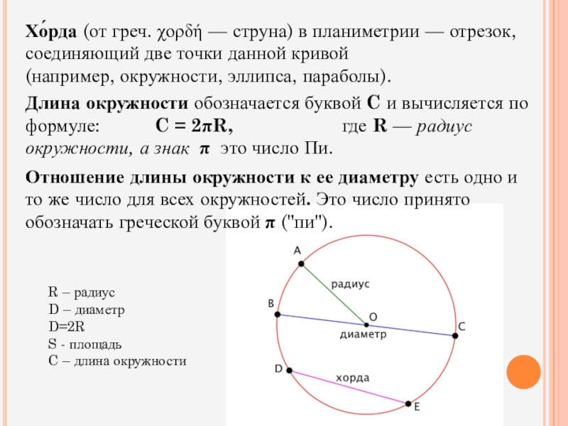 Отношение длины окружности к ее диаметру есть одно и то же число для всех окружностей. Это число принято обозначать греческой буквой π ("пи").