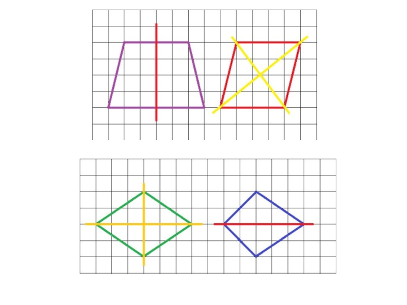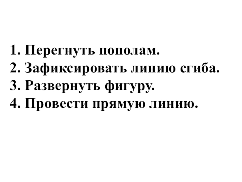 1. Перегнуть пополам.2. Зафиксировать линию сгиба.3. Развернуть фигуру.4. Провести прямую линию.