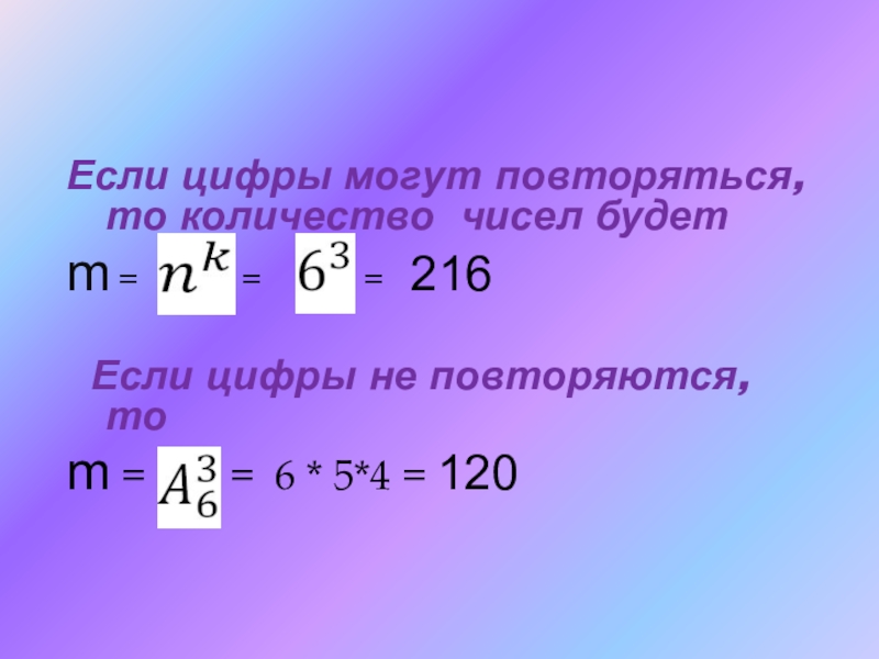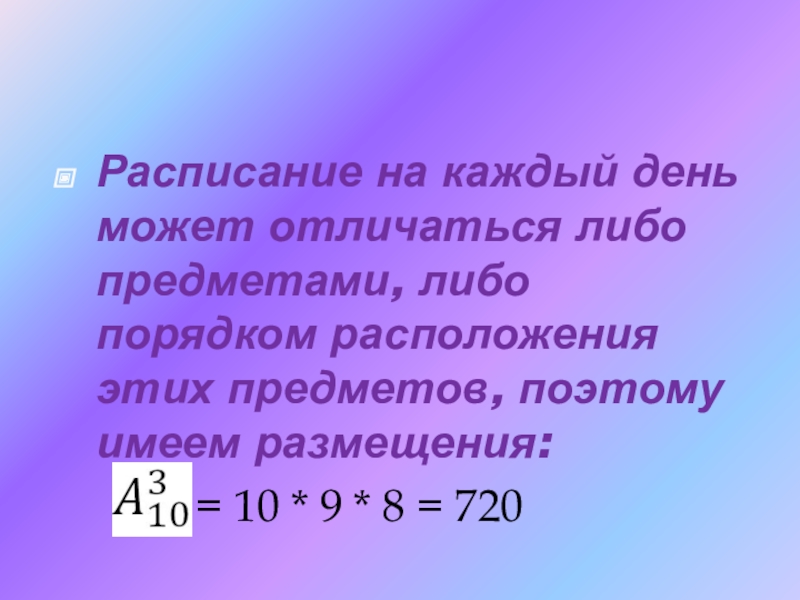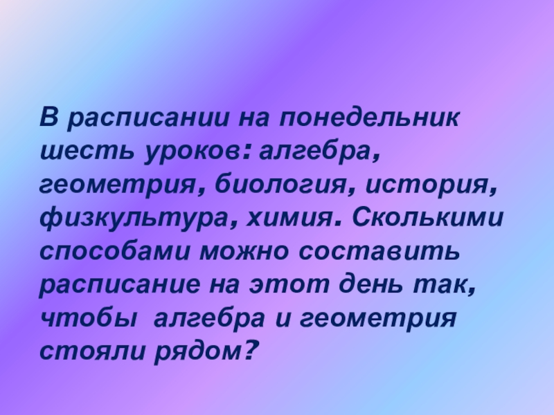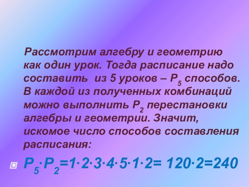 расписание надо составить из 5 уроков – Р5 способов. В каждой из полученных комбинаций можно выполнить Р2 перестановки алгебры и геометрии. Значит, искомое число способов составления расписания:
