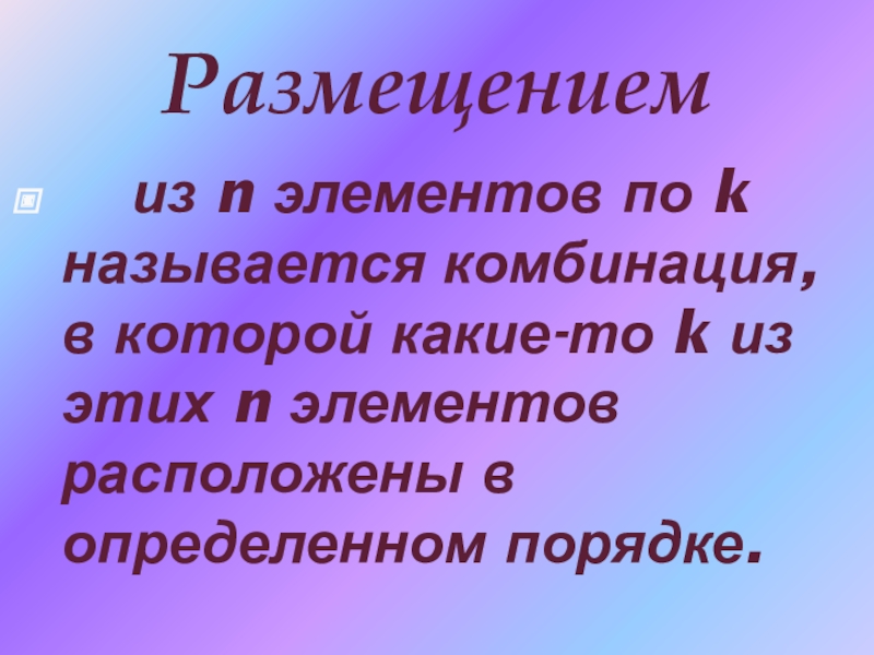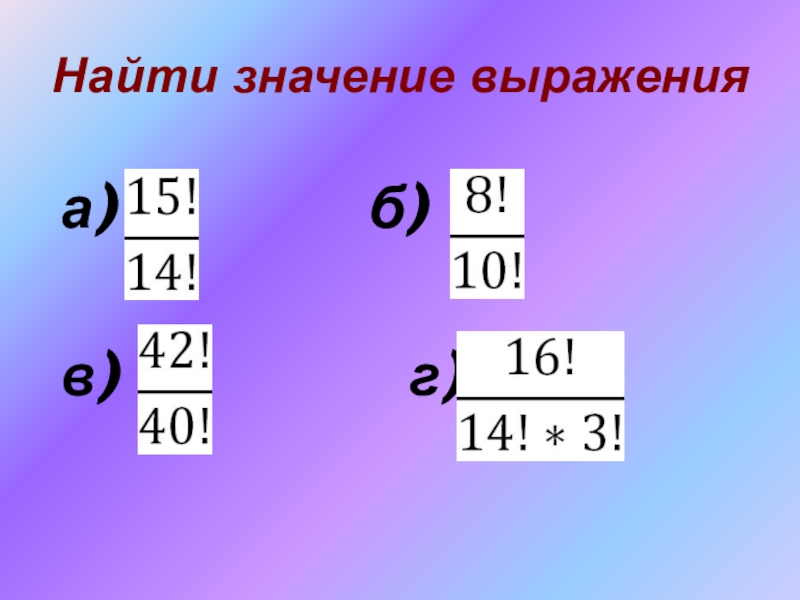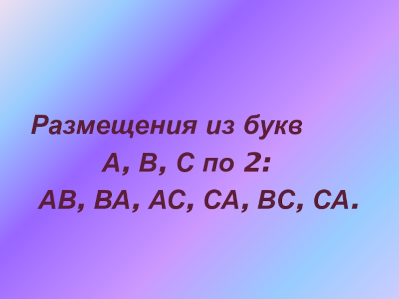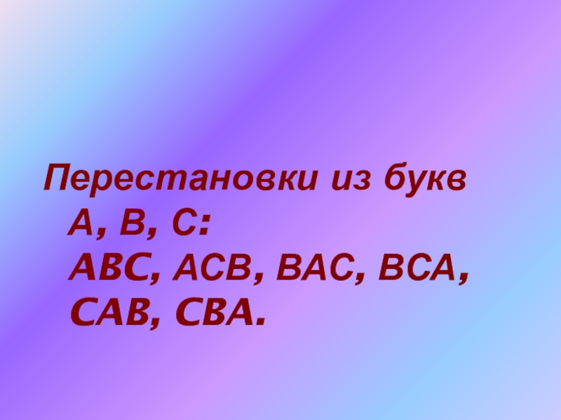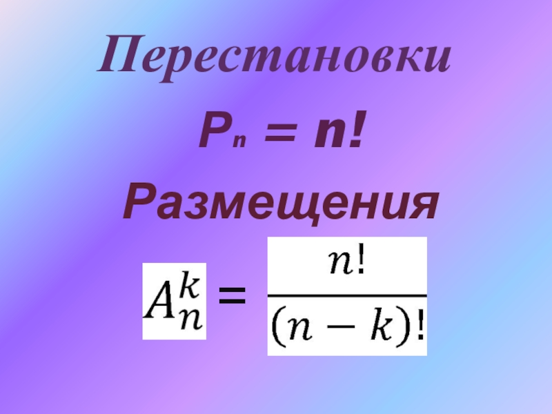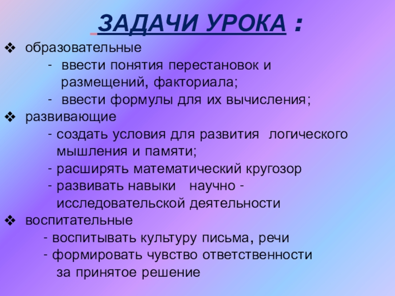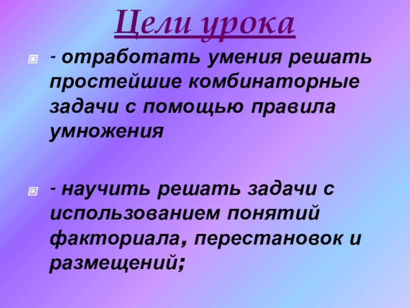 - научить решать задачи с использованием понятий факториала, перестановок и размещений;