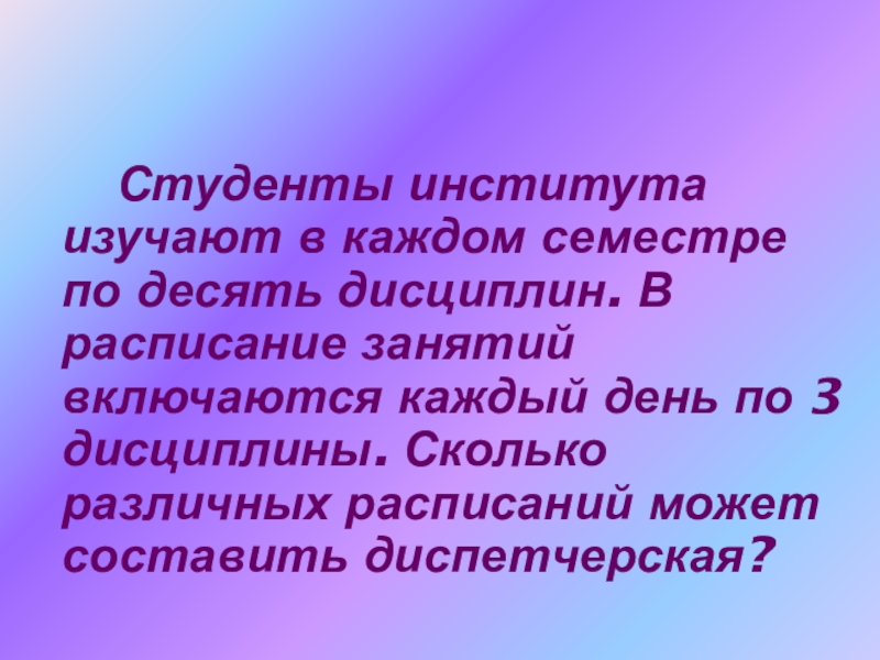 каждом семестре по десять дисциплин. В расписание занятий включаются каждый день по 3 дисциплины. Сколько различных расписаний может составить диспетчерская?