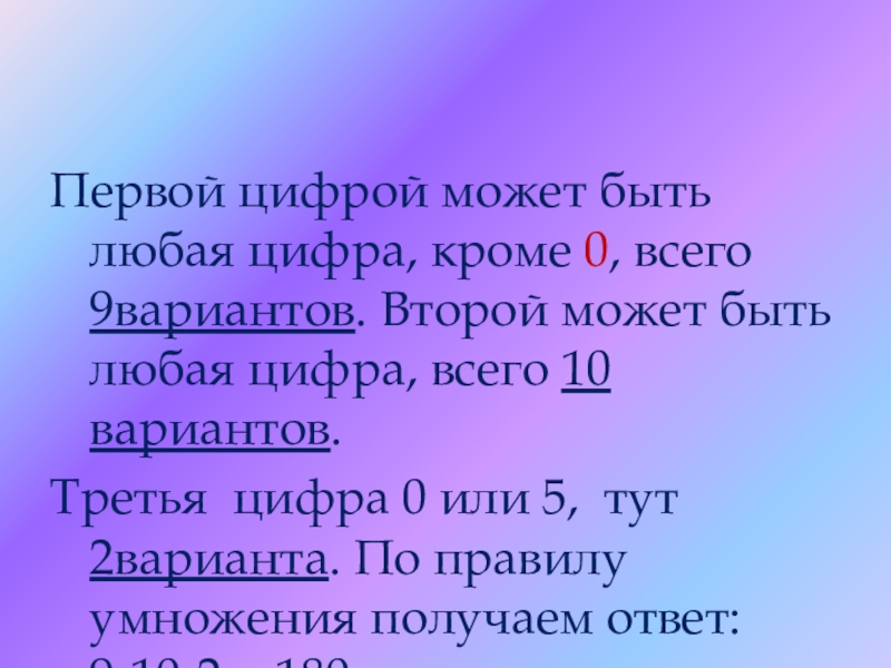 Третья цифра 0 или 5, тут 2варианта. По правилу умножения получаем ответ: 9·10·2 = 180.