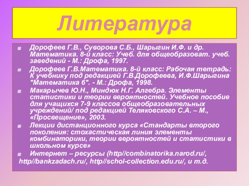 Макарычев Ю.Н., Миндюк Н.Г. Алгебра. Элементы статистики и теории вероятностей. Учебное пособие для учащихся 7-9 классов общеобразовательных учреждений/ под редакцией Теляковского С.А. – М., «Просвещение», 2003.