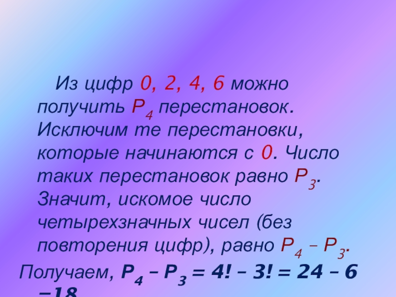 Получаем, Р4 – Р3 = 4! – 3! = 24 – 6 =18.