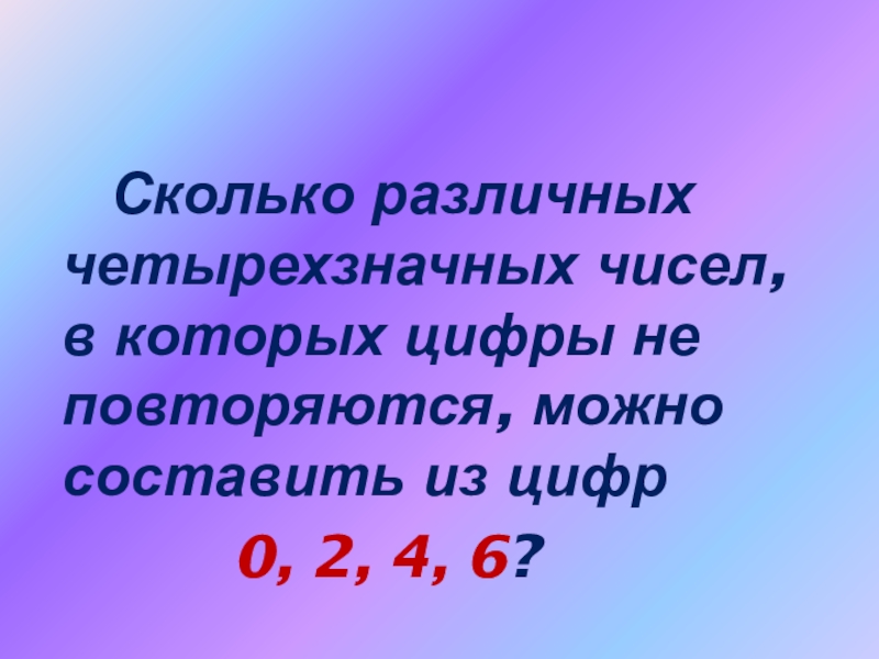 получить Р4 перестановок. Исключим те перестановки, которые начинаются с 0. Число таких перестановок равно Р3. Значит, искомое число четырехзначных чисел (без повторения цифр), равно Р4 – Р3.
