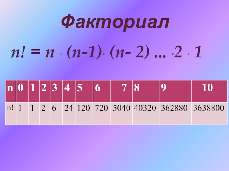 n! = п * (п-1)* (п- 2) ... *2 * 1