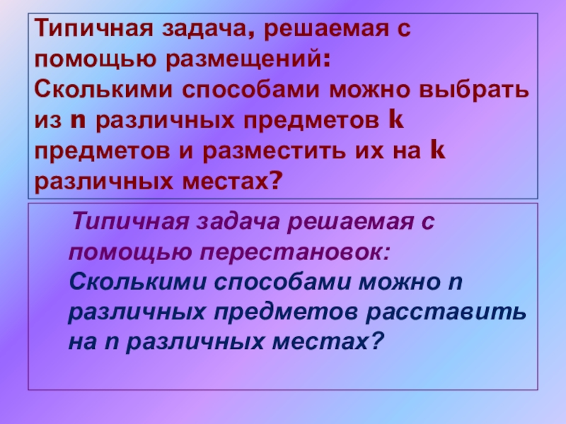 Типичная задача решаемая с помощью перестановок: Сколькими способами можно n различных предметов расставить на n различных местах?