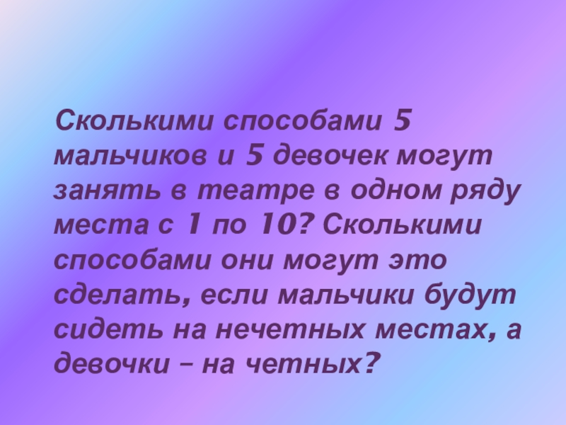 Если мальчики сядут на нечетные места, то существуют Р5 способов их расположения. Столькими же способами могут расположиться девочки на четных местах. Каждому способу расположения мальчиков соответствует Р5 способов расположения девочек.