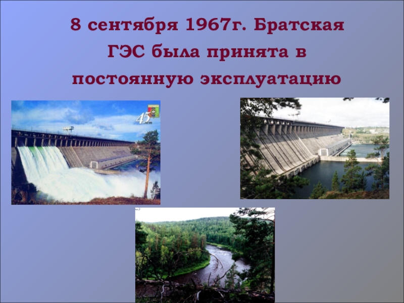 8 сентября 1967г. Братская ГЭС была принята в постоянную эксплуатацию