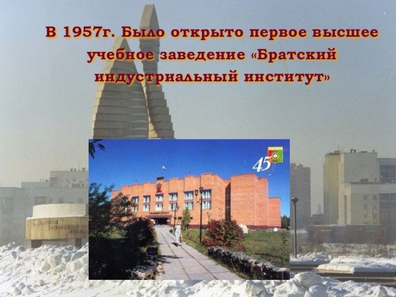 Слайд 11В 1957г. Было открыто первое высшее учебное заведение «Братский индустриальный институт»