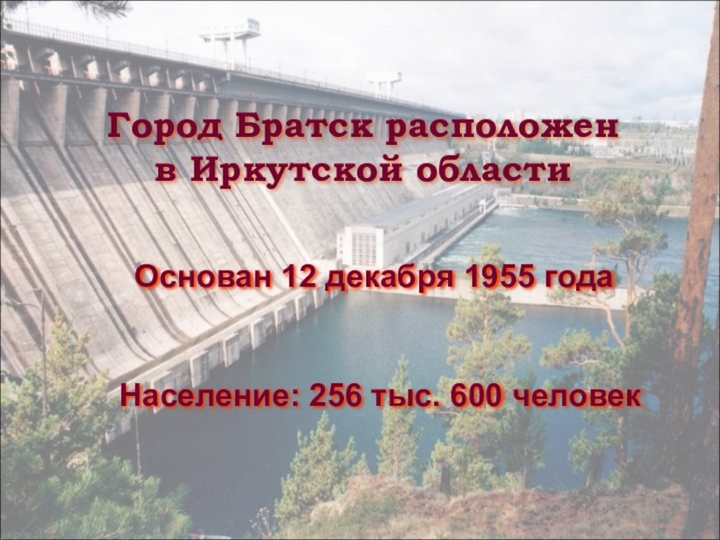 Город Братск расположен в Иркутской областиОснован 12 декабря 1955 годаНаселение: 256 тыс. 600 человек