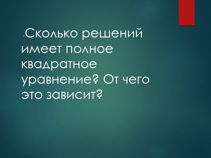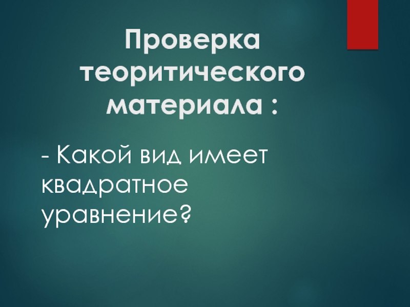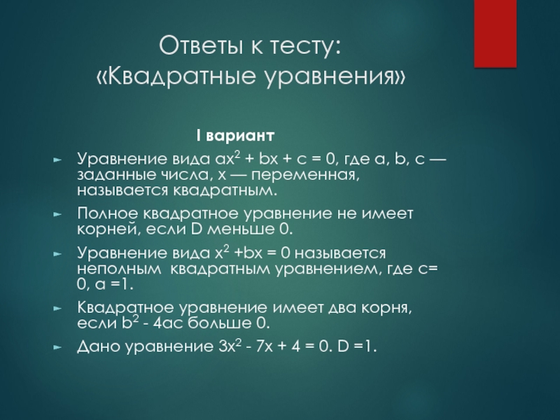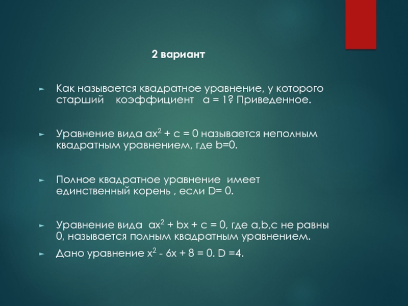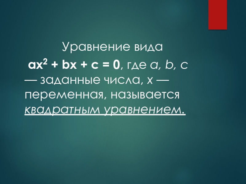 Уравнение вида ax2 + bx + c = 0, где a, b, c — заданные числа, x — переменная, называется квадратным.
