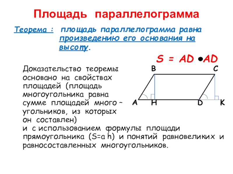параллелограмма ( S=a h) и понятий равновеликих и равносоставленных многоугольников.