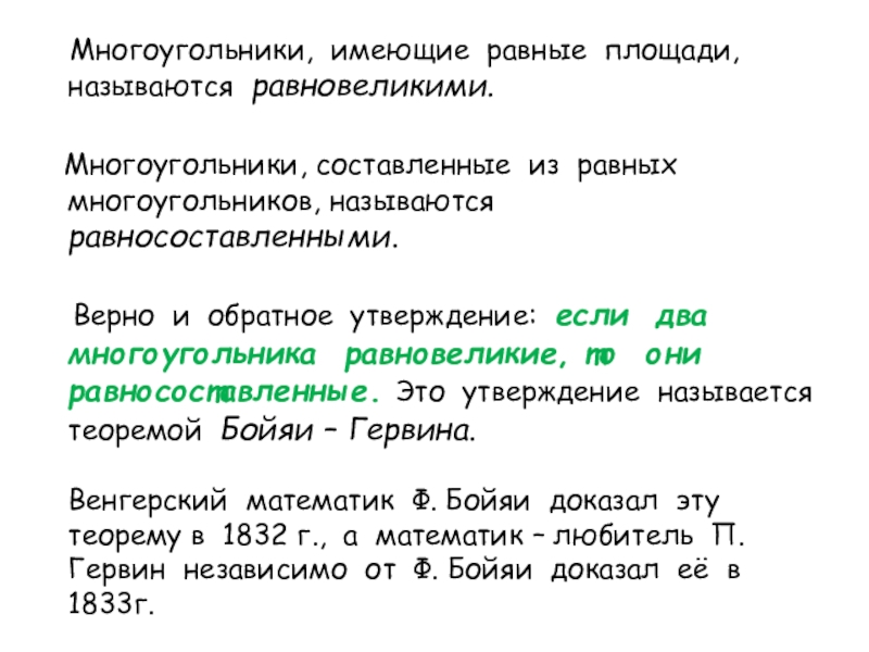 Слайд 12 Многоугольники, имеющие равные площади, называются равновеликими.
