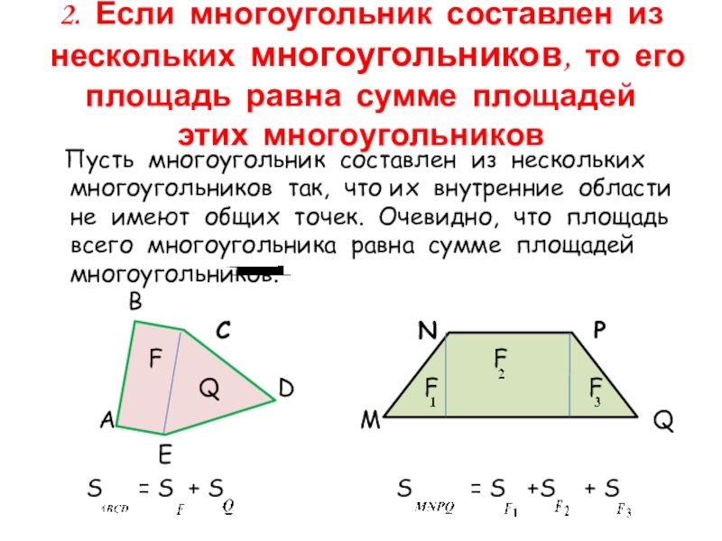2. Если многоугольник составлен из нескольких многоугольников, то его площадь равна сумме площадей этих многоугольников