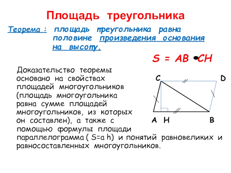 помощью формулы площади треугольника (S= a h) и понятий равновеликих и равносоставленных многоугольников.
